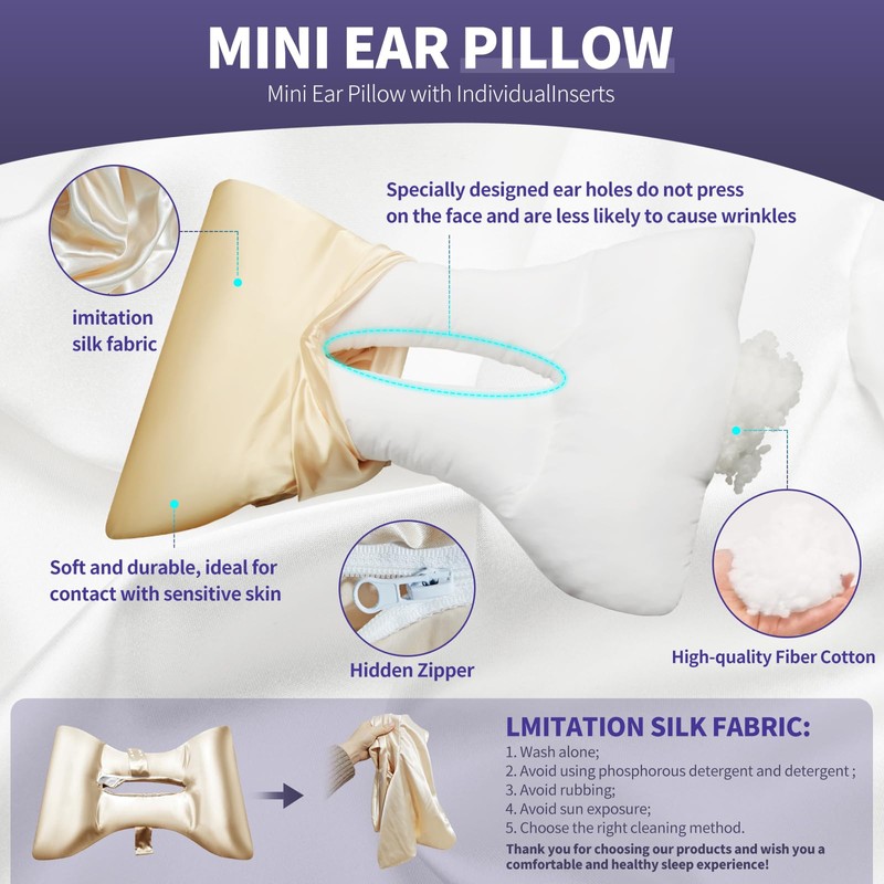 Nockovi Side Sleeper Piercing Pillow with Champagne Satin Pillowcase - Anti-Aging, Anti-Wrinkle Facial Pillow for Hair and Skin, soothes Ear, Neck and Shoulder Pain, Cervical Support