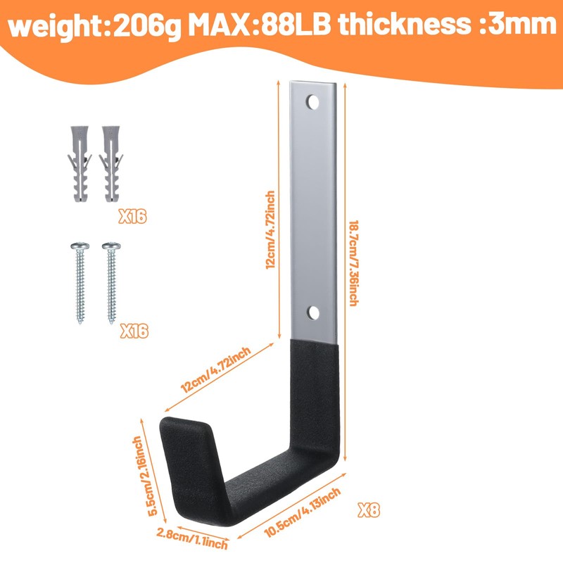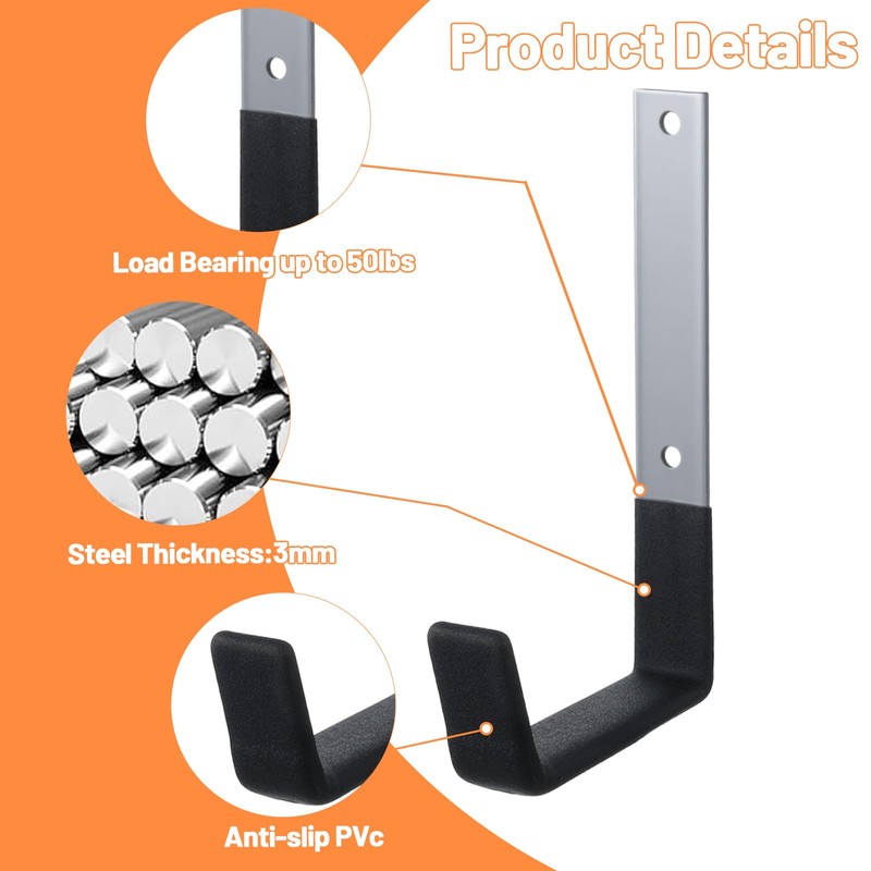 - Sturdy & Durable These heavy duty garage hooks are constructed from high-strength steel with a protective powder coating, ensuring long-lasting durability and resistance to rust and corrosion. Each hook supports up to 55 lbs, making them ideal for hanging bulky items like bikes, ladders, and garden tools. The anti-slip PVC coating prevents scratches and keeps items securely in place, whether used indoors or outdoors.