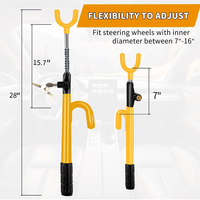 NOEAIKE Steering Wheel Lock,Heavy Duty Anti-Theft Car Device,Adjustable Length Locking with 3 Keys Universal Fit for Cars Trucks Vans and SUVs (Yellow)