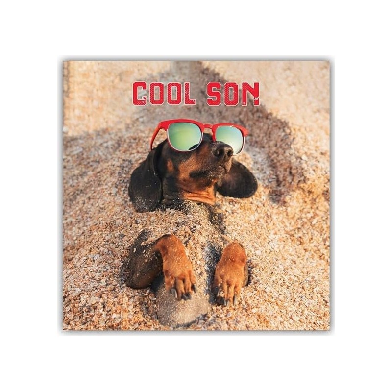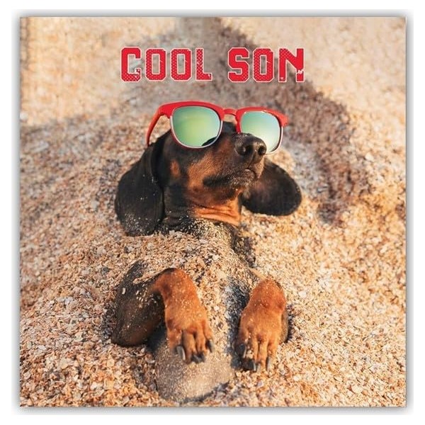 - APPEALING UNIQUE DESIGN: featuring a adorable design of a Dachshund laying in the sand wearing sunglasses, along with the greeting: "Cool Son". The card comes with a coordinating envelope.