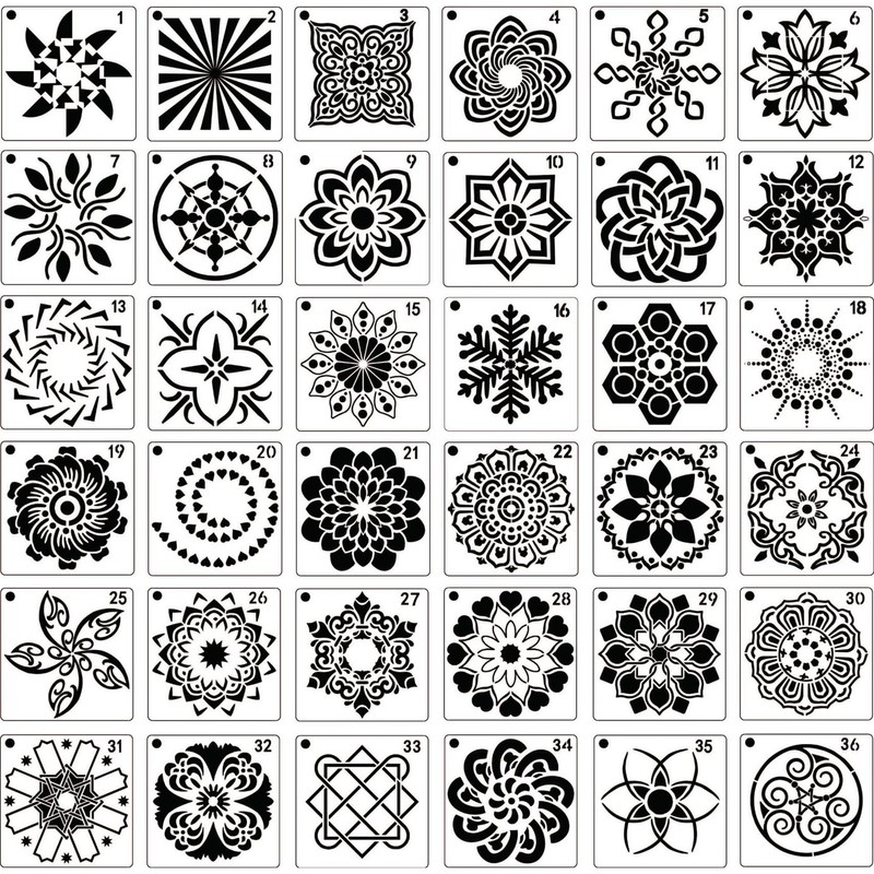 - This is a mysterious and beautiful "mandala" stencil sheet with a geometric design. Choose from 36 and 56 different sets. Material is durable and environmentally friendly PET material. Washable and reusable. Enjoy drawing with many kinds of mandala templates