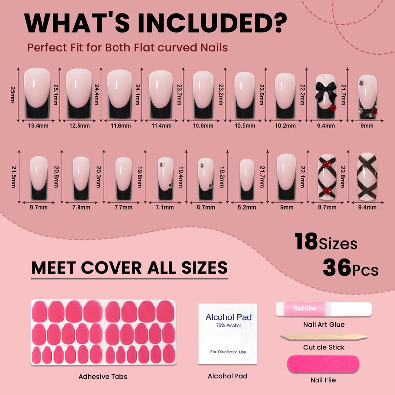 - Goth French Tip Design:This manicure is a black French style with a 3D butterfly bow design. It is a Gothic style manicure. Adorned with red rhinestones, it is like a playful and cute elf dancing in the dark night. The sweet and cool personality combines with each other. You can wear this manicure at makeup parties, music festivals, Halloween, Christmas, New Year's parties, and pair it with your outfit to show your charm