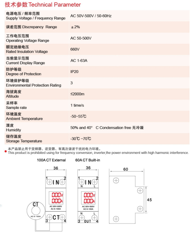 NOFUEL Din-raiI AC voltage and current meter NDM1-63 ,LED display meter AC 50-500V 2P