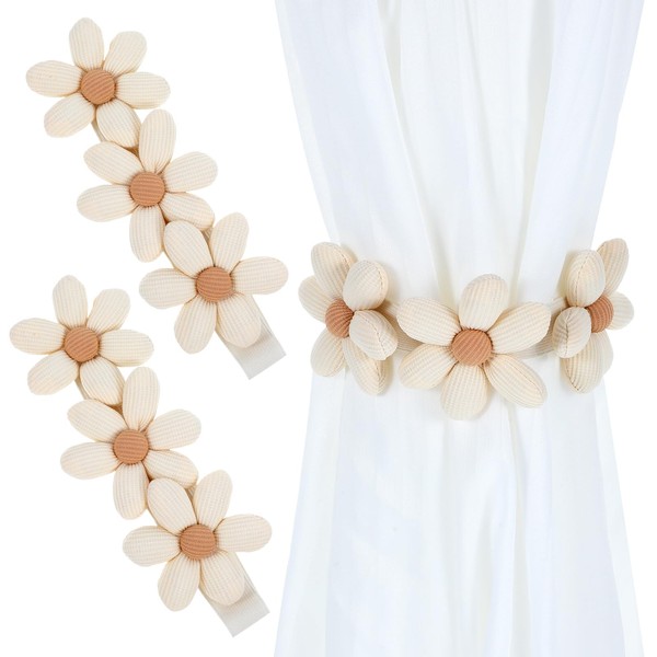 Nogeqi 2 Pack Flower Curtain Ties for Drapes, Cute Boho Curtain Tiebacks Holdbacks Clips Buckles with Snap Button Decorative Rope for Bedroom Window Treatment (Cream)