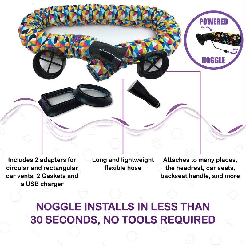 • Turbo Powered Comfort - This powered Noggle is the ultimate comfort system for your car. The built-in fan quickly moves air, preventing sweaty, uncomfortable and potentially dangerous car rides for children and pets in the summer and keeping them warmer during the winter. Made in the USA.