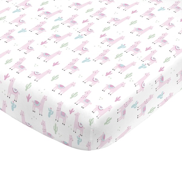 NoJo Super Soft Pink Llama Nursery Mini Crib Fitted Sheet, Pink, White, Green