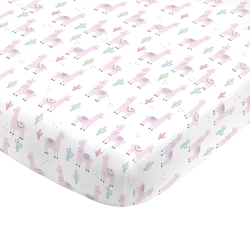- The NoJo Pink Llama Fitted Mini Crib Sheet features shades of pink, green, pale blue and white, all on 100% polyester microfiber fabric.