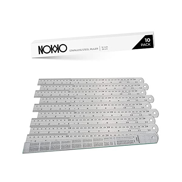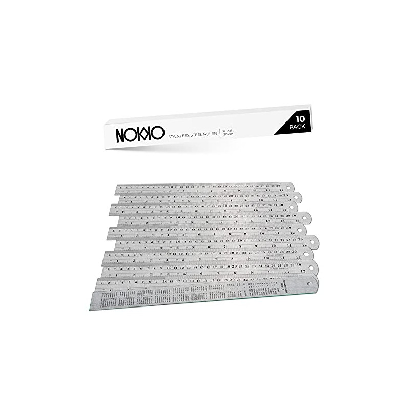 NOKKO Metal Ruler 10-Pack - Measuring Set of 12-Inch/30cm Stainless Steel Rulers - Imperial & Metric Measurements & Conversion Table - Etched Markers Start at The Very Edge of The Straight Edge Ruler