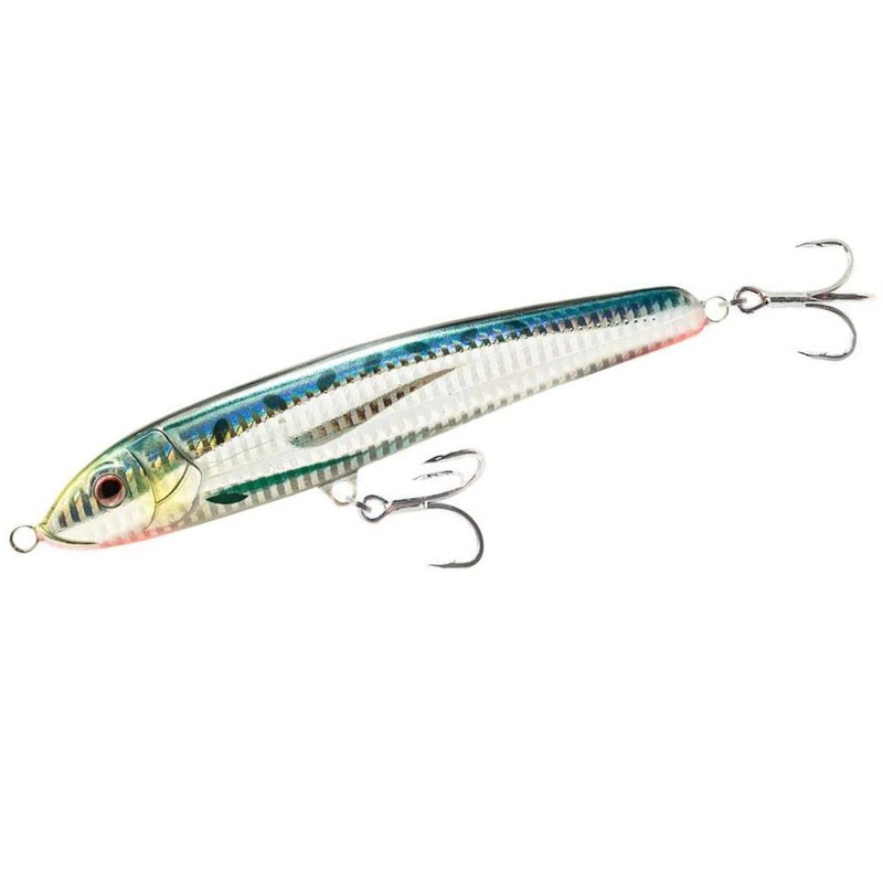 Another Unique Nomad Designs creation, which may at first look like a typical baitfish profile floating stickbait. However, the Riptide has been designed with a V shape belly design and carefully placed weights that allows you to make this big lure do a walk the dog surface retrieve, in addition to the long rod sweep underwater S shaped swimming and splashing action. The relatively flat sides and concave scallop along the body adds to the distinctive S shaped action. This design also creates a distinct body roll at slower retrieve speeds as well as the S shaped swimming action that drives fish crazy. Purpose built with HD ABS plastic and foam filled, the 2mm machine stamped metal plate through the body then creates the ultimate tough lure. Ideal for GTs, dogtooth tuna, kingfish and tuna.