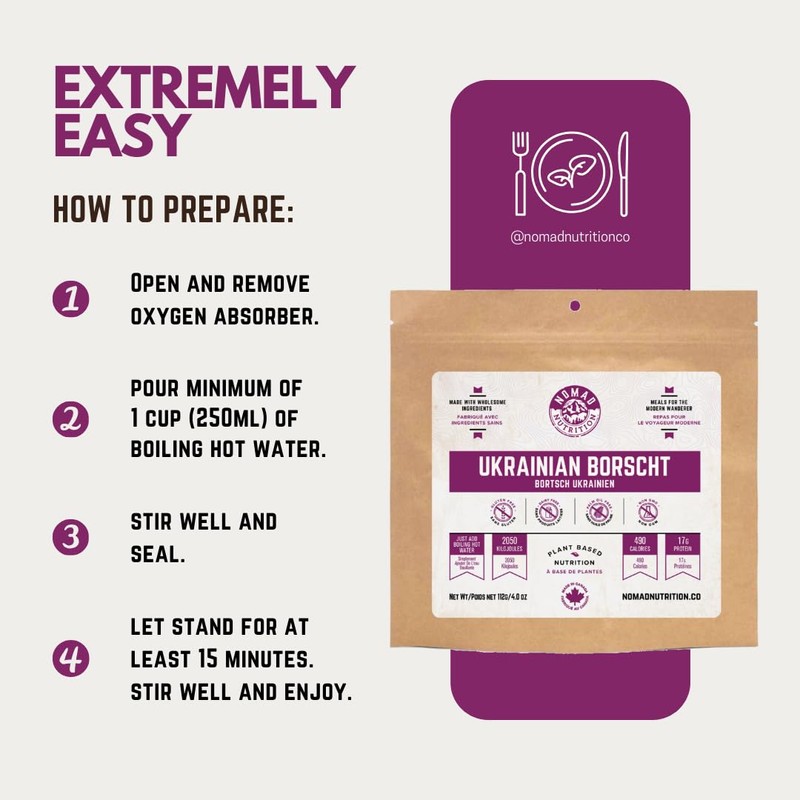 - 𝗤𝗨𝗜𝗖𝗞 & 𝗘𝗔𝗦𝗬 - Don’t have time to cook, but craving something wholesome and tasty? Our Ukrainian Borscht can be ready in minutes with just a bit of boiling water – each packet contains 470 calories and 15 grams of protein. Nomad Nutrition’s Ukrainian Borscht is your answer to a quick, nutritious, and hassle-free meal anytime, anywhere. Whether you’re at home, in the office, or conquering the great outdoors, this meal will keep you fueled and satisfied