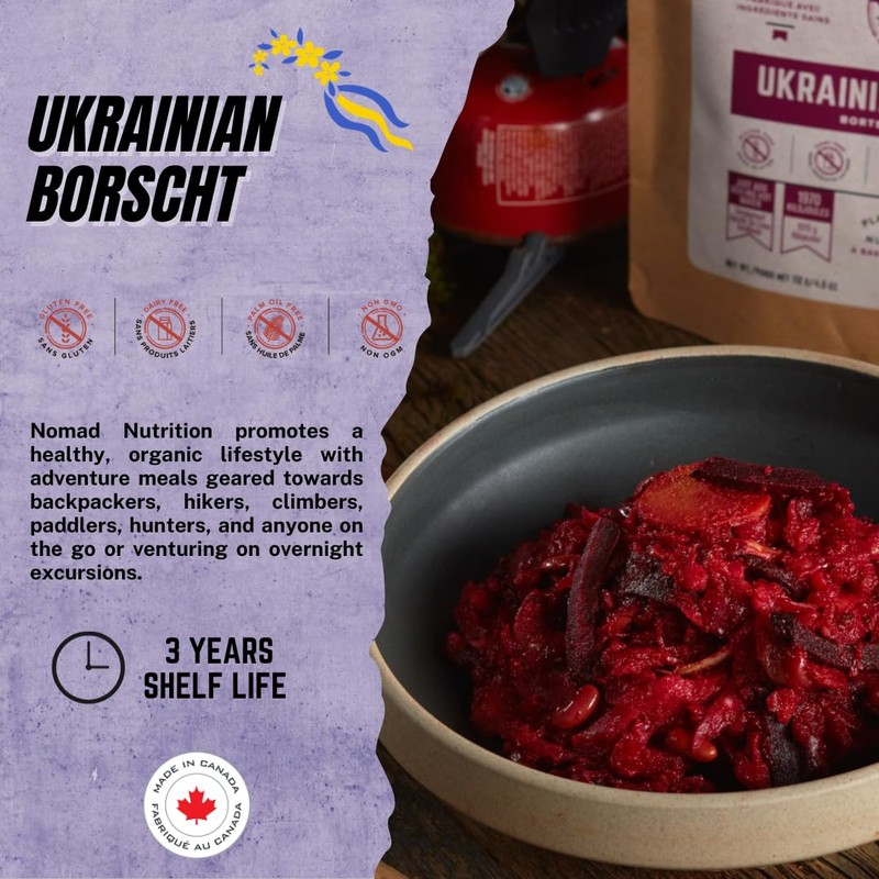 - 𝗨𝗞𝗥𝗔𝗜𝗡𝗜𝗔𝗡 𝗕𝗢𝗥𝗦𝗖𝗛𝗧 – Experience the Heartland with Nomad Nutrition’s Ukrainian Borscht. Our Ukrainian Borscht, the first soup released by Nomad Nutrition is a modern twist on a heartwarming recipe. Designed by our mothers, who firmly believe it could make even the most seasoned grandma jealous – this borscht isn’t just a soup; it’s a warm embrace from home. It’s a taste of tradition without the wait, whether you’re at home or out exploring the world