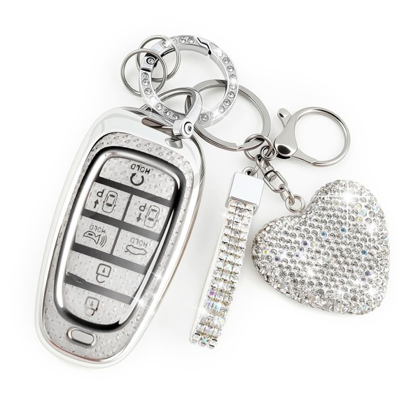 Nomiyo Key Fob Cover with Diamond, Compatible with Hyundai Nexo 2019-2025, Fit for Sonata Santa Fe Tucson, Sparkling TPU Key Case and Elegant Heart Decoration for Women (7 Button, Silver)