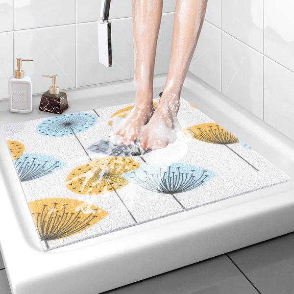 Non-Slip Safety Shower Mat, 60 x 60 cm, Soft Comfort Bath Mat with Drainage Holes, PVC-Loofah Massage Shower Mats for Wet Areas, Quick Drying (Square Dandelion, 60 x 60 cm)