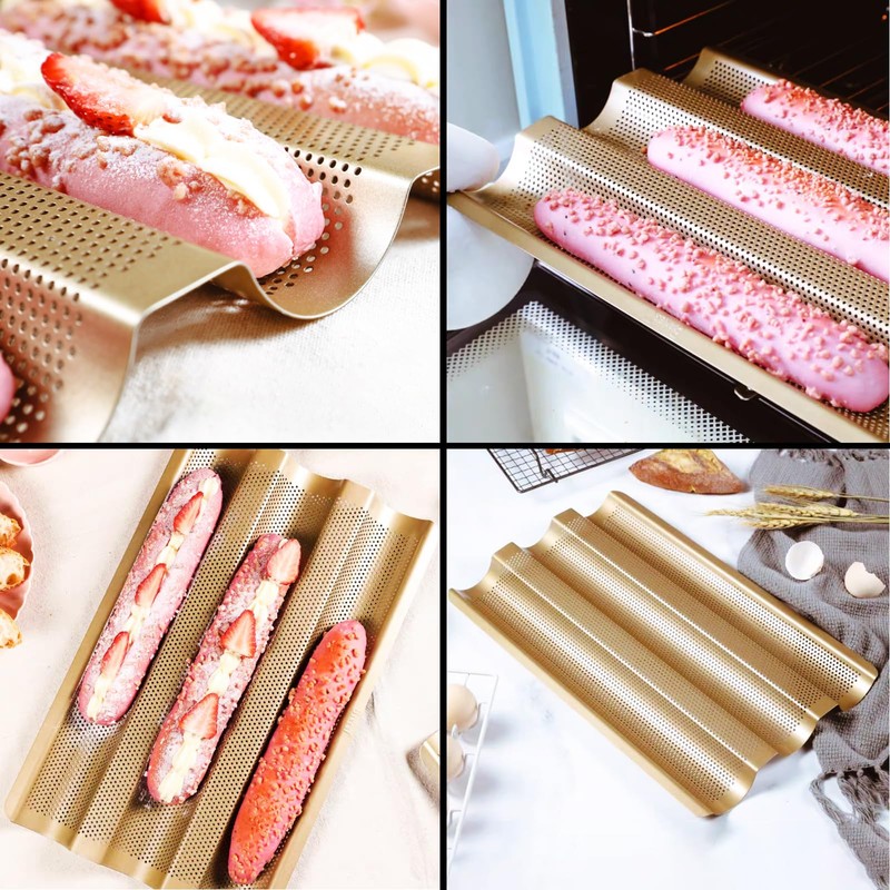 - PROFESSIONAL DESIGN: Gold-coloured perforated baking tray specifically designed for baking 4 perfect French baguettes or bread loaves simultaneously