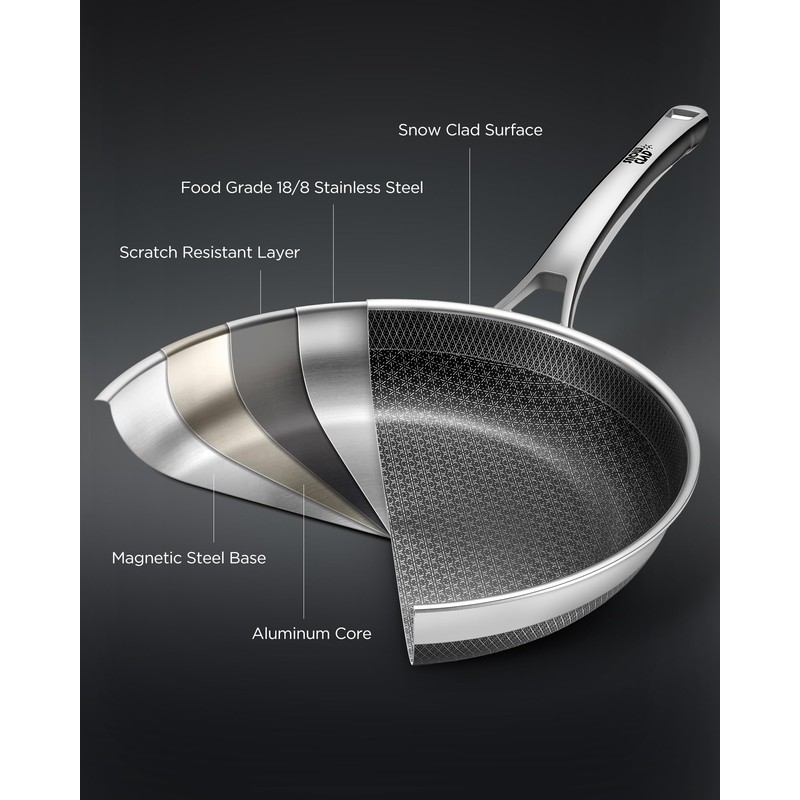 - 〔Surface of SnowFlake〕: Our non stick frying pans feature a fusion of stainless steel and a non-stick layer, crafted with precision laser etching. This innovative structure delivers excellent heat conduction while shielding the non-stick surface. The coating ensures effortless food release, allowing ingredients to slide off more smoothly than on traditional stainless steel pans.