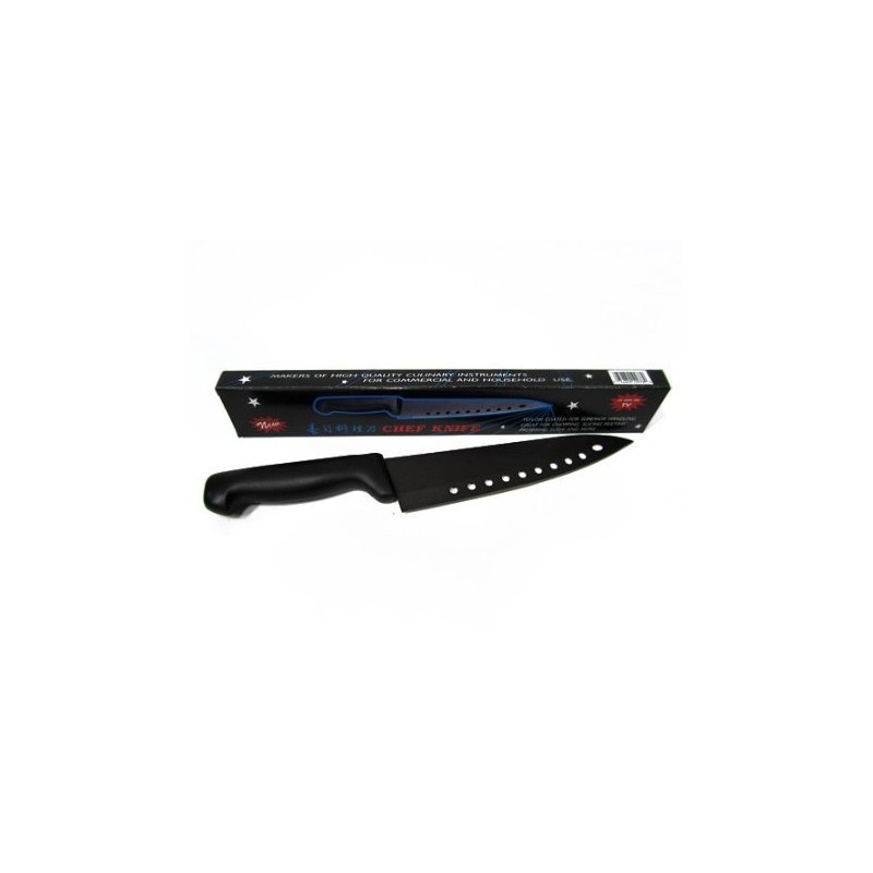 Specifically designed to prevent sticking and make cutting easier. This chef's knife is perfect for sushi, but would work great for cutting almost anything. The non-stick coating and integrated holes in the blade help to prevent food from sticking. This will allow you to cut faster, easier and more frustration free. The coating allows this knife to glide effortlessly through raw fish, vegetables, meats, cheeses and more. The 10 "vents" along the edge of the blade not only reduce sticking, but they also make the knife lighter and more easy to handle. This aeration allows for more air flow in order to reduce friction while preventing the suctioning action that makes food stick. This knife will glide through sushi rolls and resist sticking to rice. It features a super sharp blade made from stainless steel and an ergonomic handle design. A large 8 inch blade makes it the perfect size for any number of food preparation tasks. Stop food from sticking to your knife and make cutting and chopping easier.