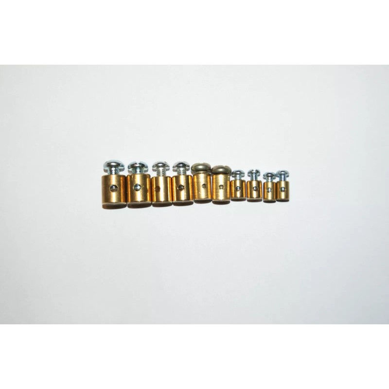 ITEMS UP FOR SALE YOU GET 10 CABLE STOPS YOU GET 2 OF EACH SIZE FIRST SIZE 3/8W X 7/16L 3MM CABLE HOLE,SECOND SIZE 5/16W X 10MML 2.5MM CABLE HOLE,THIRD SIZE 3/16W X 7MML 2MM WIRE HOLE,FOURTH SIZE 6MM WIDTH BY 7MM LENGTH, 2MM CABLE HOLE,FIFTH SIZE 7MM WIDTH x 10MM LENGTH,1.5MM CABLE HOLE,ALL THE CABLE STOP CABLE HOLES COULD BE ENLARGED BY USING A AWL OR FILE OR DILL BIT BRASS IS EASY TO WORK WITH. GREAT TO MAKE YOUR OWN CABLES AND KEEP ON HAND OR GREAT TO KEEP IN YOUR TOOL KIT ON THE BIKE TO FIX BROKEN CABLES WHILE OUT ON THE ROAD OR TRAIL.CHECK YOUR SIZE BEFORE YOU BUY TO SEE IF THIS WILL WORK FOR YOUR MACHINE.