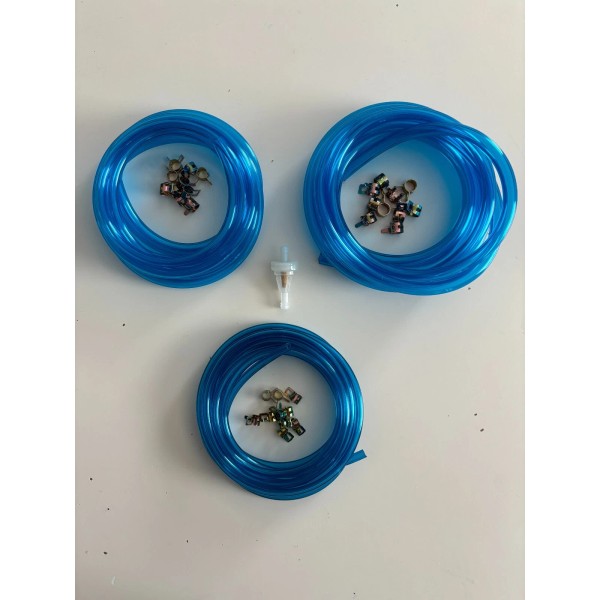 ITEM UP FOR SALE IS YOU GET 10 FT OF 1/8 IN HOLE PRIMER HOSE VENT HOSE OIL HOSE + 10 CLAMPS + 10FT 1/4 HOLE FUEL LINE AND 10 HOSE CLAMPS + 10FT 3/16 HOLE FUEL LINE AND 10 HOSE CLAMPS AND ONE FUEL FILTER.FUEL LINE MADE OF SPECIAL FORMULATED VINYL THAT WAS TESTED WITH 15% METHANOL, -22 TO 195F TEMP, GOOD STUFF!!!!