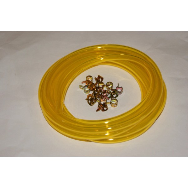 ITEM UP FOR SALE YOU GET 5 FT OF YELLOW CLEAR FUEL LINE 1/4 HOLE AND WITH 3/8 OUTSIDE MEASUREMENT AND 15 FUEL LINE CLAMPS.REPLACE THAT WORN OUT FUEL LINE AT A GREAT PRICE.Vinyl Fuel & Lubricant Tubing. Special formula vinyl gas & oil
