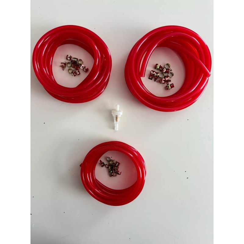 ITEM UP FOR SALE IS YOU GET 10 FT OF 1/8 IN HOLE PRIMER HOSE VENT HOSE OIL HOSE + 10 CLAMPS + 10FT 1/4 HOLE FUEL LINE AND 10 HOSE CLAMPS + 10FT 3/16 HOLE FUEL LINE AND 10 HOSE CLAMPS AND ONE FUEL FILTER.FUEL LINE MADE OF SPECIAL FORMULATED VINYL THAT WAS TESTED WITH 15% METHANOL, -22 TO 195F TEMP, GOOD STUFF!!!!