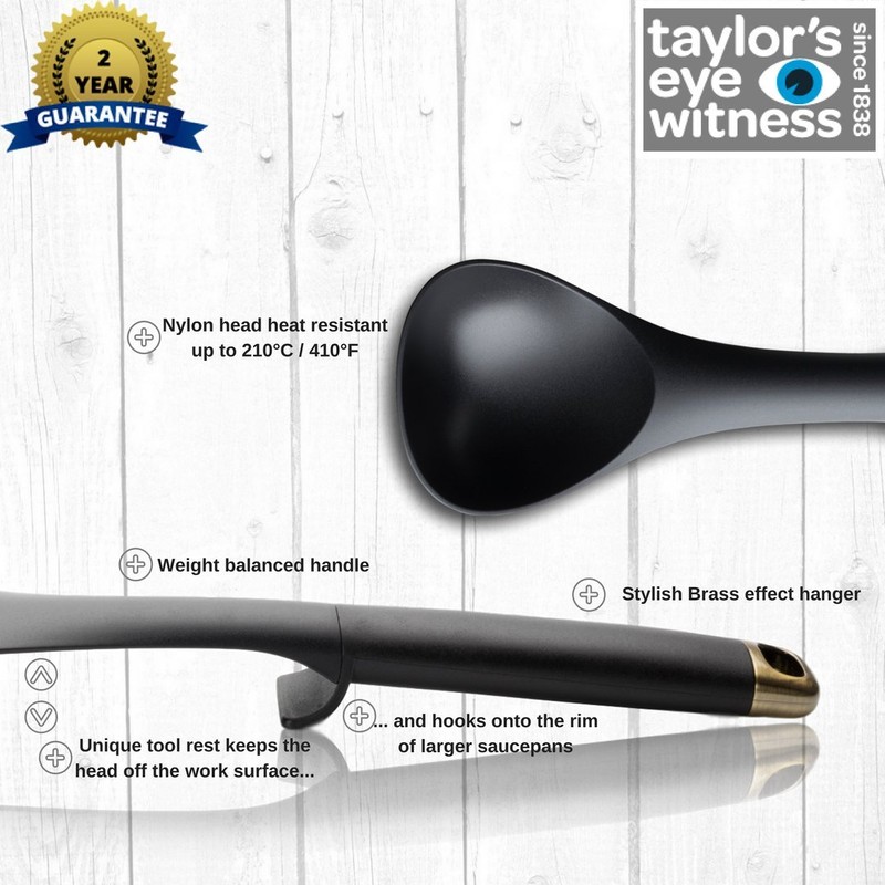 Nonstick Sauce Serving Ladle Utensil - Hard Wearing Black Nylon, Brass Handle Hanger. Heat Resistant to 210°C. Unique Integrated Tool Rest for Extra Hygiene. Brooklyn Range by Taylors Eye Witness
