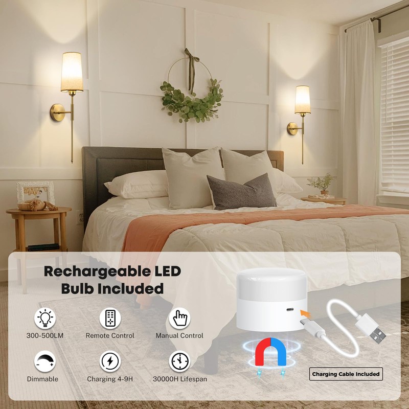 - 13000mAh Rechargeable Light Bulbs: The battery operated wall sconces set of two comes with 2 rechargeable lights bulbs, 2 remote and 2 USB Type-C charging, if with lowest birghtness max lighting 70 hours after full charge. These sconces are an essential backup during power outages.