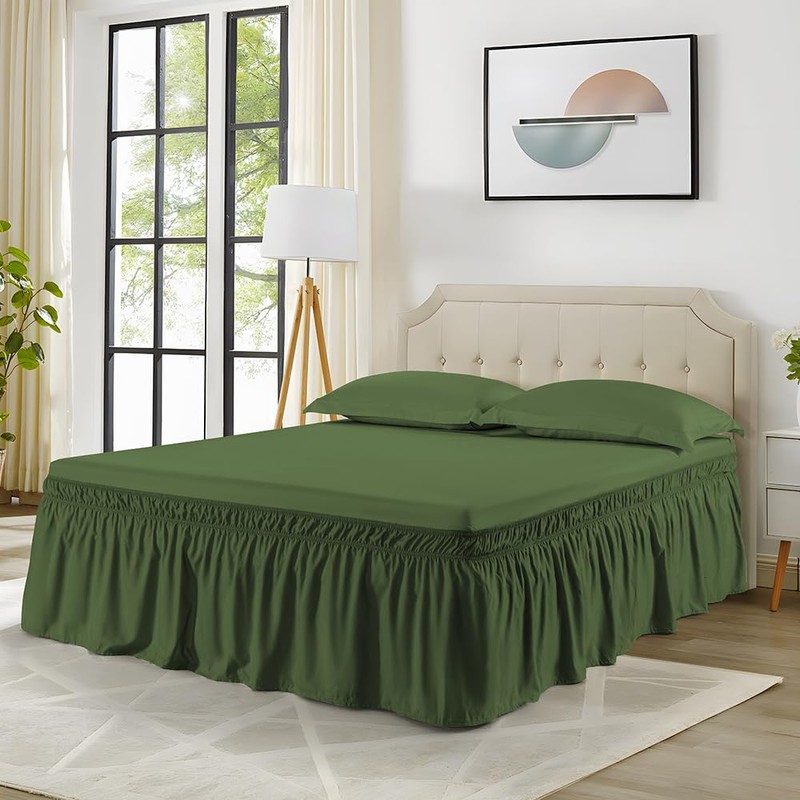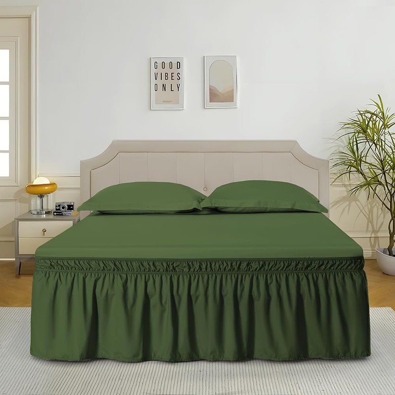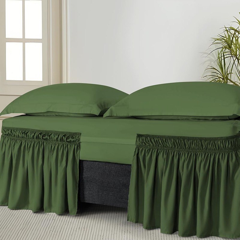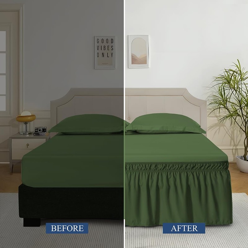 - 【EASY to INSTALL】The wrap around bed skirt is designed to sew three-sided ruffle bed skirt on both sides of the bed and at the end of the bed. A widened high elastic band is used at the head of the bed. On the whole, there are adjustable elastic bands around the skirt, which can be wrapped around the bed without the need to lift the mattress.