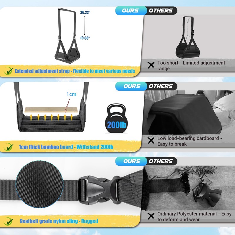 - [New Upgraded Flight Foot Rest]: Built with high-density nylon straps and a 1cm thick bamboo base, our plane foot hammock is both sturdy and reliable. It can support up to 200 pounds, ensuring stability and safety for all users. The quick-release buckle makes installation and removal a breeze, so you can set it up in seconds and focus on relaxing during your flight.