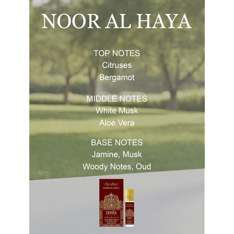 - Noor Al Haya - 6ml (.2 oz) Perfume Oil Roll-On by ZENIA Noor Al Haya Perfume Oil is a radiant blend of freshness and depth—crafted for those who embody grace and quiet strength. This roll-on oil delivers a smooth, long-lasting fragrance that feels both luminous and grounding. Top Notes: Bright Citruses and crisp Bergamot open the scent with a refreshing spark full of energy and light. Middle Notes: The heart reveals the soft elegance of White Musk paired with the clean, cooling touch of Aloe Vera, adding purity and serenity. Base Notes: Finally, Jasmine, Musk, Woody Notes, and Oud create a sensual and timeless foundation—floral, musky, and richly layered. Noor Al Haya Perfume Oil is perfect for those who seek a scent that is fresh yet enduring—refined, graceful, and deeply captivating.