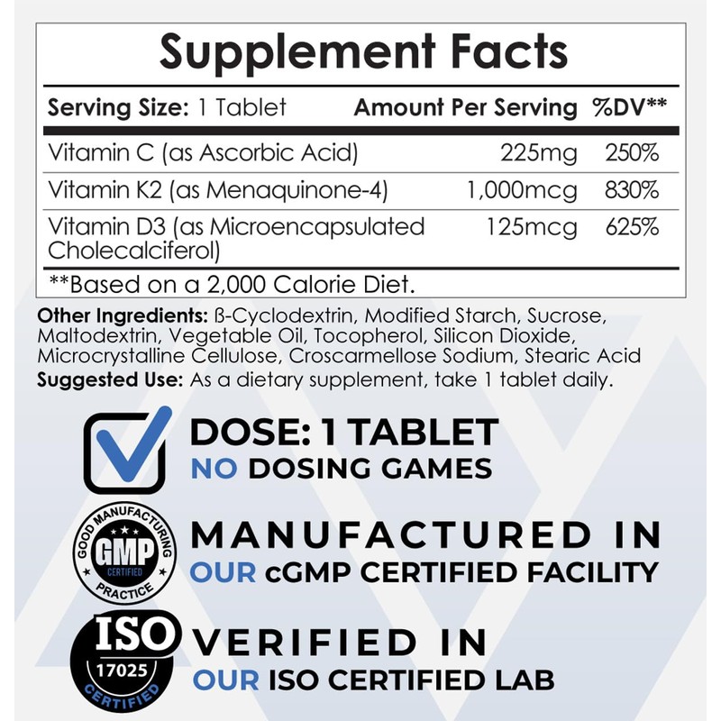 - Supports Bone Health: Our Vitamin D3 + K2 with Vitamin C tablets can play an integral role in maintaining strong and healthy bones, by aiding in calcium absorption and distribution.