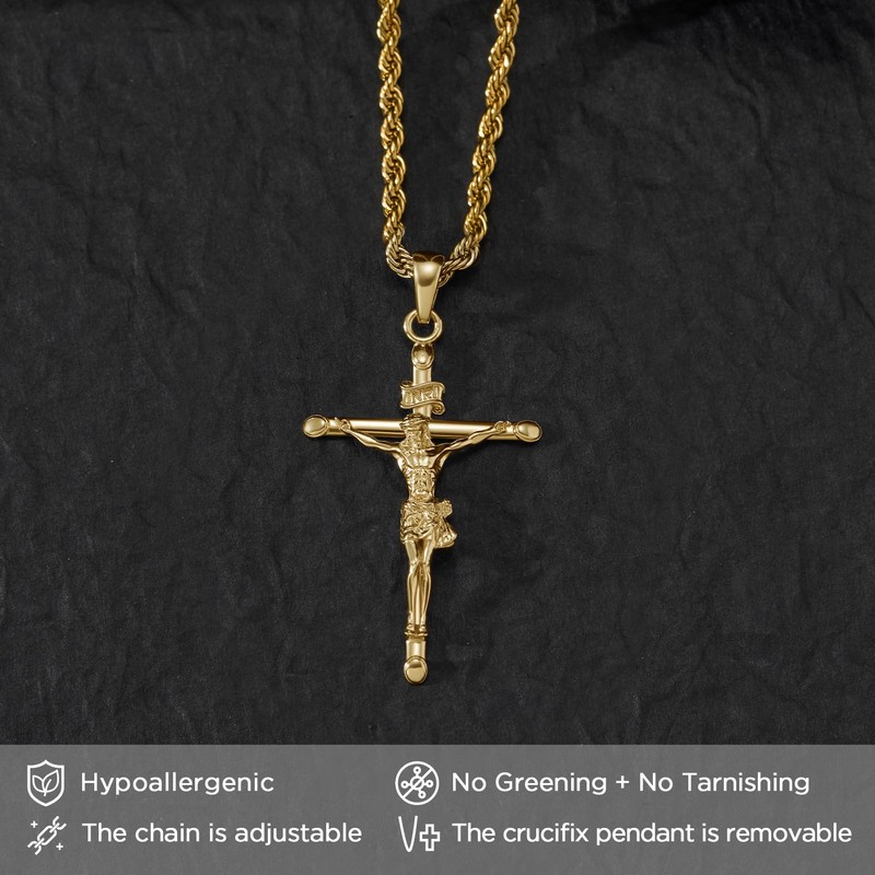 - Material: The crucifix pendant is crafted from sterling silver, hypoallergenic material safe for any skin. The chain is made from sturdy stainless steel, combining durability with style for everyday wear. Tarnish-resistant, Lead and Nickel free.