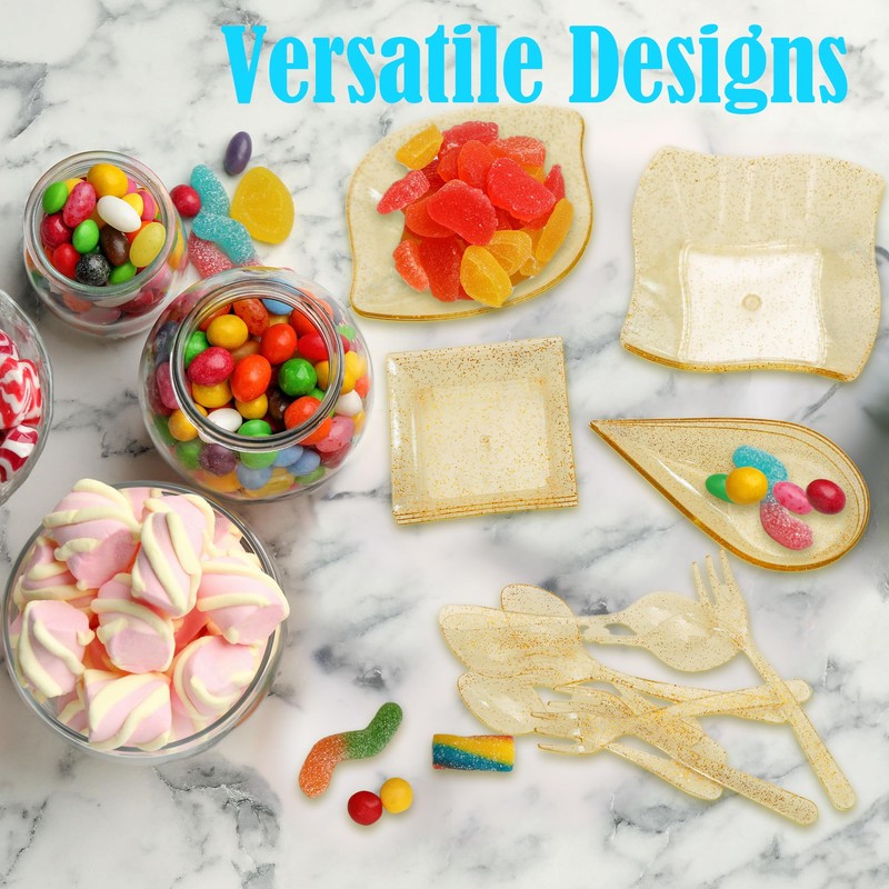 - ✅Practical Design: Featuring 4 unique shapes—including classic squares, elegant leaves, twisted edge, and modern teardrops—these mini square dessert plates with gold glitter accents beautifully showcase desserts, snacks, and appetizers. The lightweight yet durable design ensures they are easy to handle and resistant to breakage