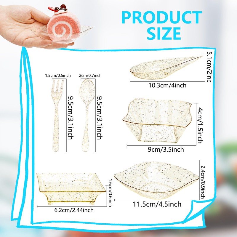 - ✅Size Detail: This set includes 4 styles of plates—square plate 2.4 inch/ 6 cm wide, twisted edge bowl 3.5 inch/ 9 cm wide, leaf-shaped dessert plate 4.5 inch/ 11.5 cm wide, 0.9 inch/ 2.4 cm high, and teardrop plate 4 inch/ 10.3 cm long, 2 inch/ 5 cm wide. Spoons measure 3.74 inch/ 9.5 cm, forks measure 3.74 inch/ 9.5 cm, perfectly sized mini appetizer plates with spoons forks for elegant serving