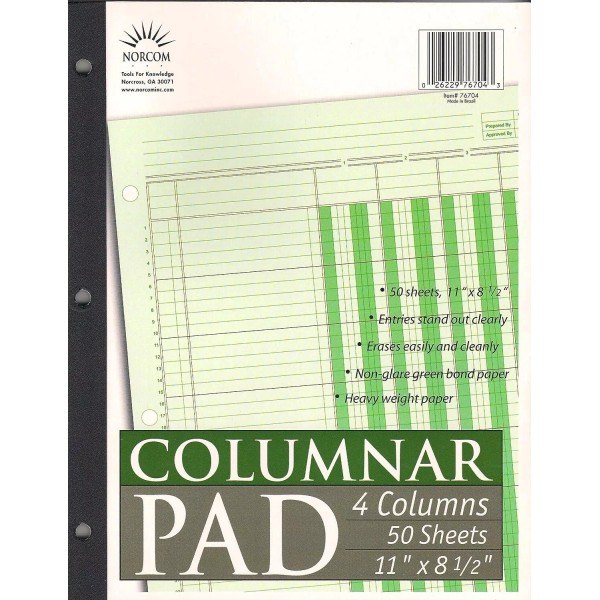 Norcom Columnar Pad, 4 Columns, 11 x 8.5 Inches, 50 Sheets