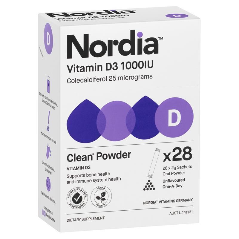 Nordia Vitamin D3 1000IU is an unflavoured, one-a-day clean label formula containing vegan friendly vitamin D to support healthy bones, healthy teeth, and immune system health. Take one sachet daily in water, juice, a smoothie, or your favourite food, or as directed by your health professional.