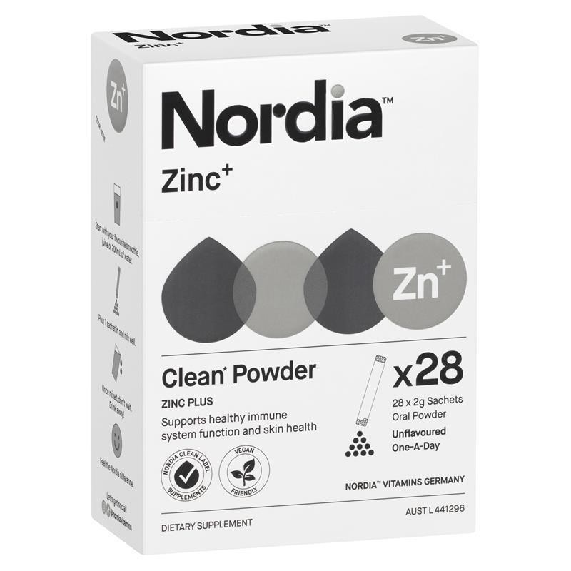 Nordia Zinc+ is an unflavoured, one-a-day clean label formula containing zinc amino acid chelate, magnesium and vitamin C to support immune system health, reproductive system health and skin health. Take one sachet daily in water, juice, a smoothie, or your favourite food, or as directed by your health professional.