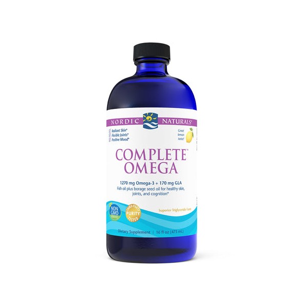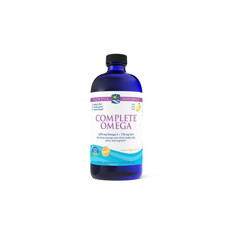 Along with the benefits of omega-3s, Complete Omega has the added benefits of of another essential fat, GLA (gamma linolenic acid) for added support for healthy skin and joints.* Complete Omega is a non-concentrated, naturally balanced formula that blends omega-3 EPA+DHA from cold-water fish with GLA and oleic acid (omega-9) from cold-pressed borage seed oil. Borage oil, a traditional herbal remedy, is also said to promote mood health.* Now that's a complete supplement. Available in liquid and soft gels.