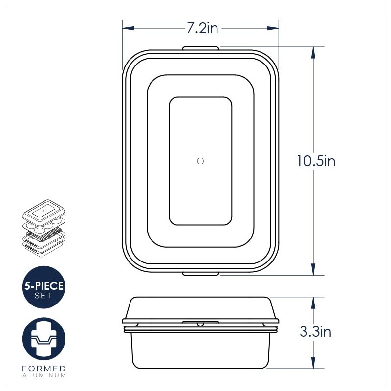 - Measurements of 5 pieces stacked with lid - 10.5 x 7.2 x 3.3 inches
