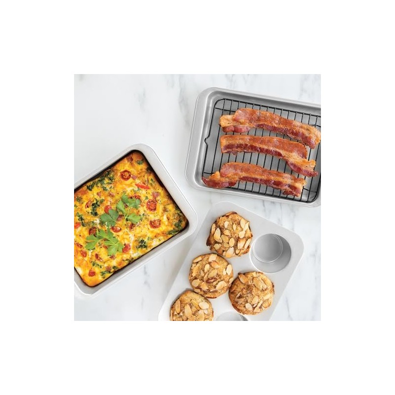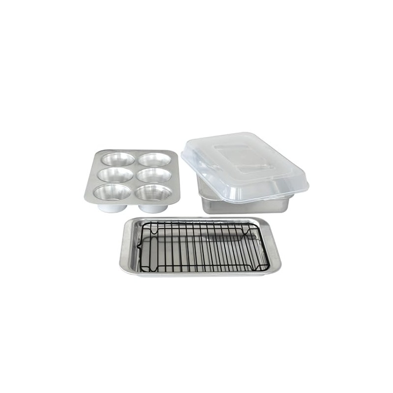 - Set inculdes five compact natural aluminum pieces: a casserole pan, 6-cavity muffin pan, baking sheet, nonstick broiling rack and a universal transparent lid that fits every piece