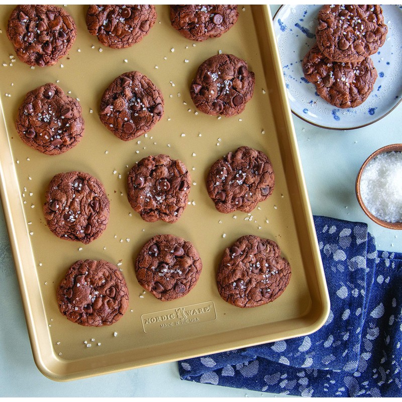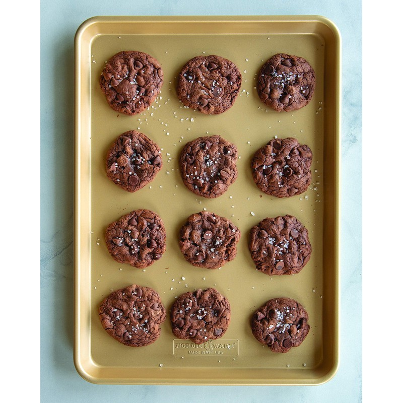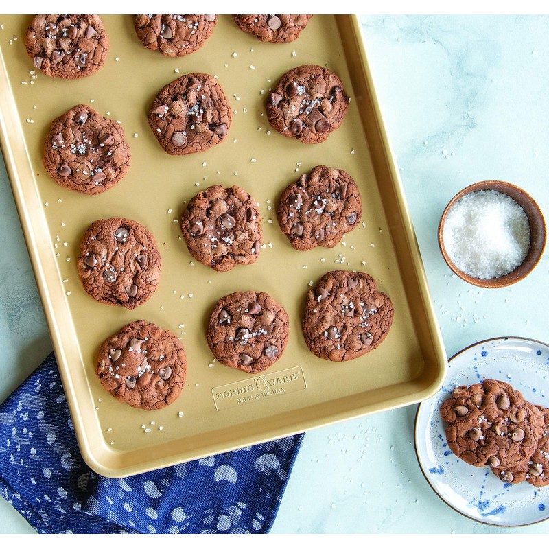 A necessity for any chef's kitchen this Bakers NonStick Half Sheet 2-Pack Set from Nordic Ware is perfect for baking brownies, cookies, or anything else that you can imagine. These Natural aluminum pans have premium gold nonstick interiors for easy release and cleaning. Our proprietary nonstick is time-tested and has proven to be especially durable and resistant to scratching. Encapsulated galvanized steel rims prevent warping. Made of aluminum for even heating and superior baking performance. Made of durable rust proof aluminum. Proudly made in the USA by Nordic Ware.