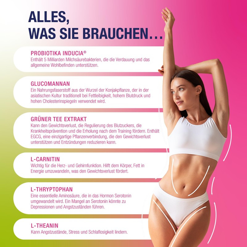 Unsere wirksame Mischung enthält Glucomannan, einen natürlichen Appetitzügler. Er kann dazu beitragen, plötzliche Hungerattacken zu verhindern und ein länger anhaltendes Sättigungsgefühl zu fördern. Grüner Tee-Extrakt ist reich an Koffein und Antioxidantien. Der Extrakt soll den Stoffwechsel beschleunigen, Fett verbrennen und die Senkung von Cholesterin- und Blutzuckerspiegeln unterstützen. Ergänzend dazu ist L-Carnitin für den effizienten Abbau von Fettsäuren verantwortlich und soll so die Vorteile des Gewichtsmanagements noch verstärken.