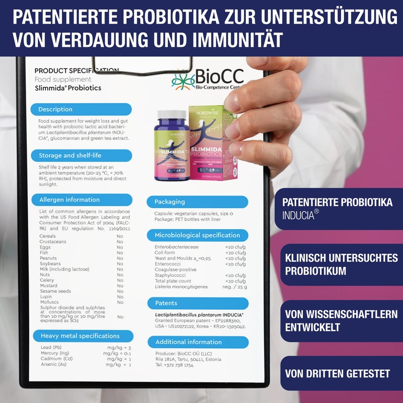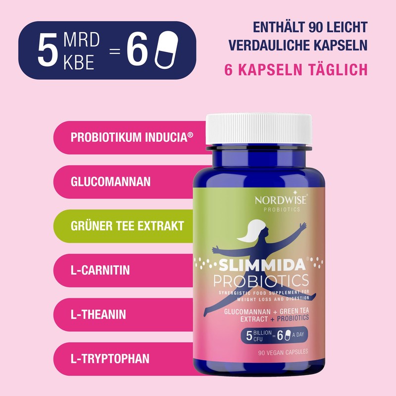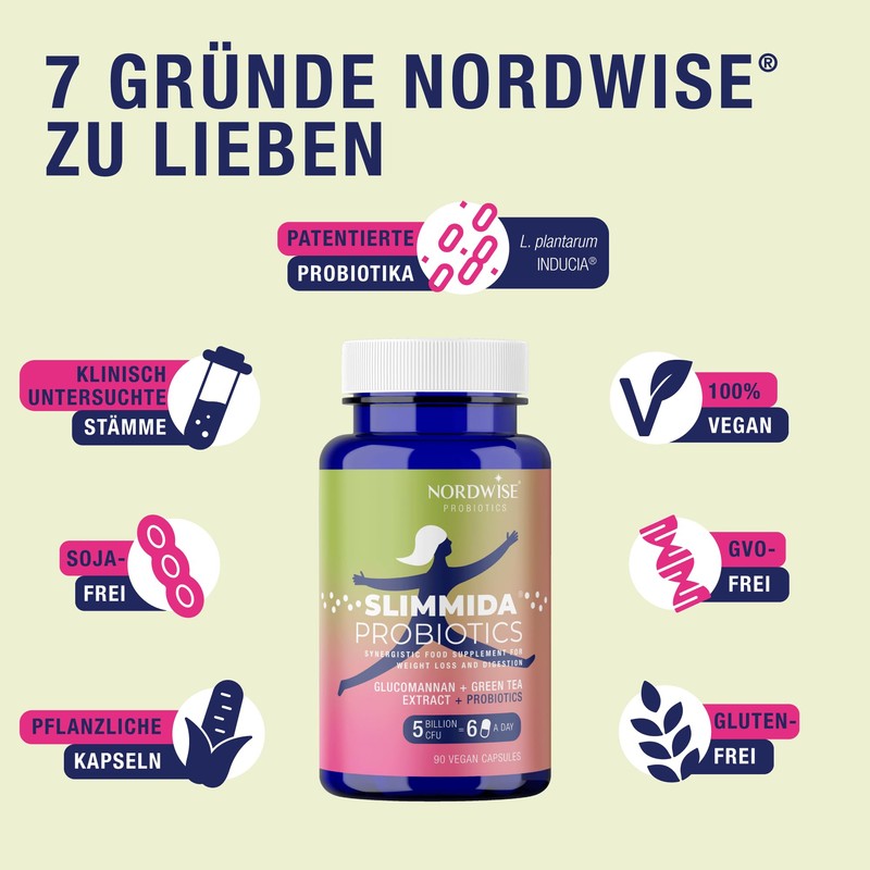 Begeben Sie sich auf eine transformative Reise zu ganzheitlichem Wohlbefinden mit NORDWISE SLIMMIDA, einem Nahrungsergänzungsmittel zum Gewichtsmanagement (90 Kapseln, 2 Wochen Vorrat). Im Zentrum unserer Formel steht der patentierte Lactiplantibacillus plantarum INDUCIA - ein probiotischer Stamm, der für seine Fähigkeit zur Förderung der Darmgesundheit und für einen erheblichen Beitrag zur Anregung des Stoffwechsels bekannt ist.