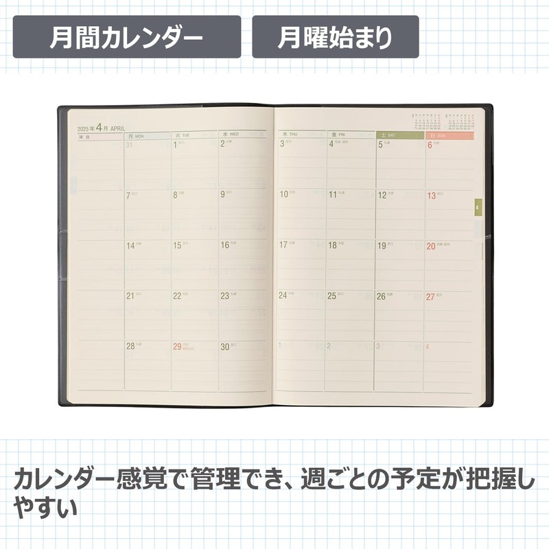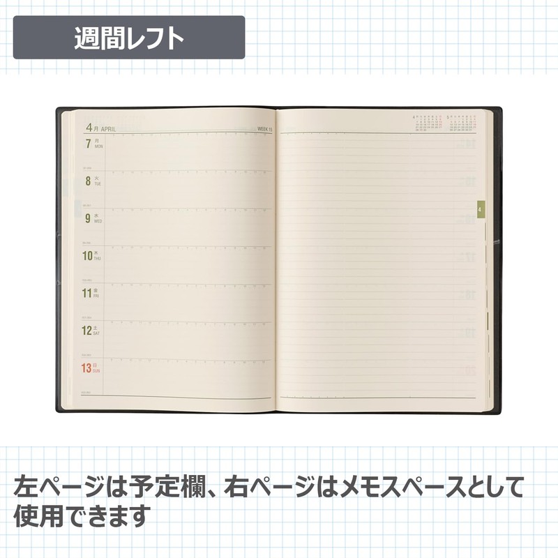 - Product Description: There is a memo page for more than 1 notebook. Recommended for those who want to manage their notebook and notebook in bulk [Monthly Page] A basic block type with 1 month opening (beginning on Monday). It looks just like a calendar and features easy to keep track of your weekly schedules. Weekly Pages: Plans on the left page in 1 week of viewing, and the right page can be used as a memo space (starting on Monday). A well-balanced notebook for appointments and memos. Model change: The design of the door has been changed