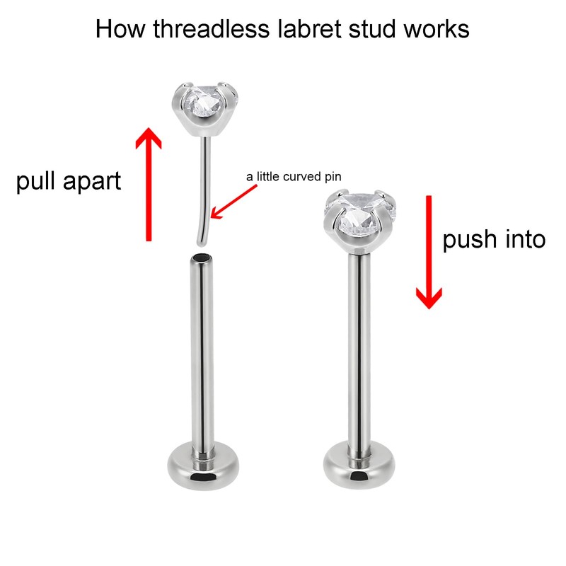 - 【FEATURES】: No thread on top,push into/pull apart the pin by hand directly.The top end has an insertion pin which is slightly bent.Threadless labret use this curved tension to holds the two pieces together securely.