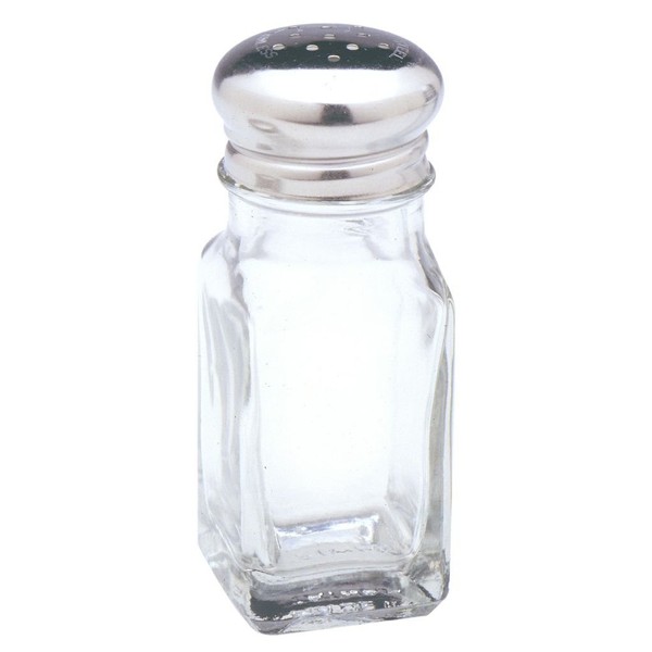 Glass shaker that can be used either salt or pepper. Measures 4 inch/10cm. Holds 3 ounces. Has a stainless steel lid. Hand washing recommended.