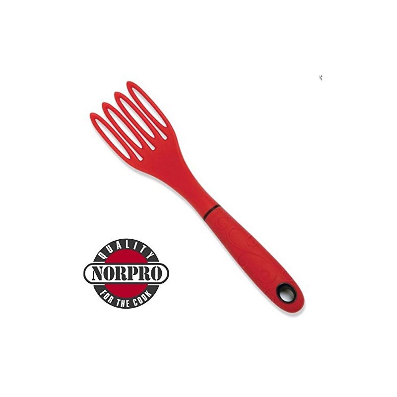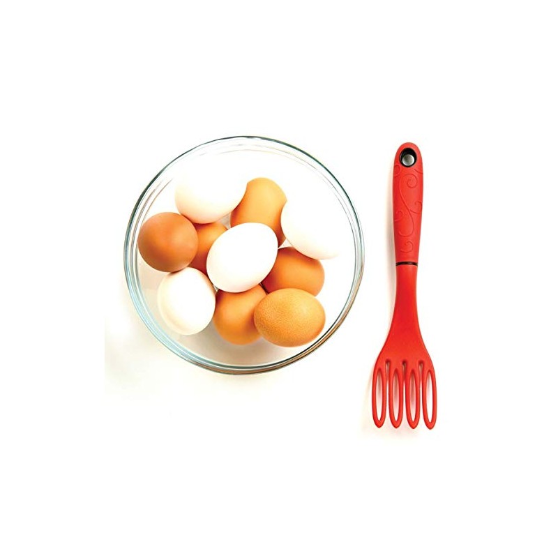 Quickly whisk, stir, mix, scoop and strain all with this one tool from Norpro. The Grip EZ Fiskie, made from santoprene in a red color, combines the best of both a fork and a whisk. Use this handy kitchen tool to incorporate air into egg whites and cream, for heavy mixing such as pancake batter and candy making, or to transfer food to a plate or bowl. Safe to use on nonstick and glass surfaces, the Grip EZ Fiskie is the perfect size to mix your protein drinks right in the glass. 2-1/2" L x 8-3/4" W x 7" H