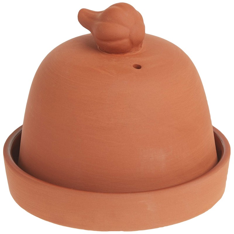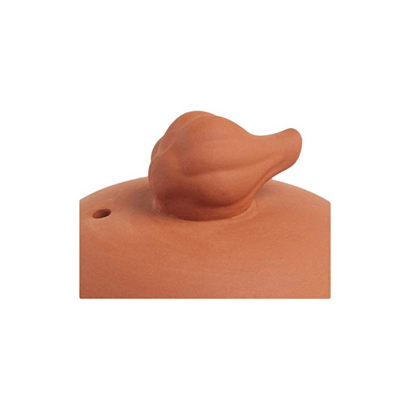 - Crafted from sturdy, natural terra cotta and features an attractive garlic-shaped handle for easy gripping.
