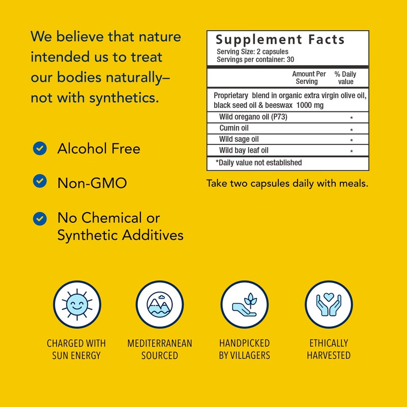 - Full Ingredient List; Wild oregano oil, cumin oil, wild sage oil, wild bay leaf oil, extra virgin olive oil, black seed oil, beeswax; Free of all chemicals, pesticides & additives; Non-GMO