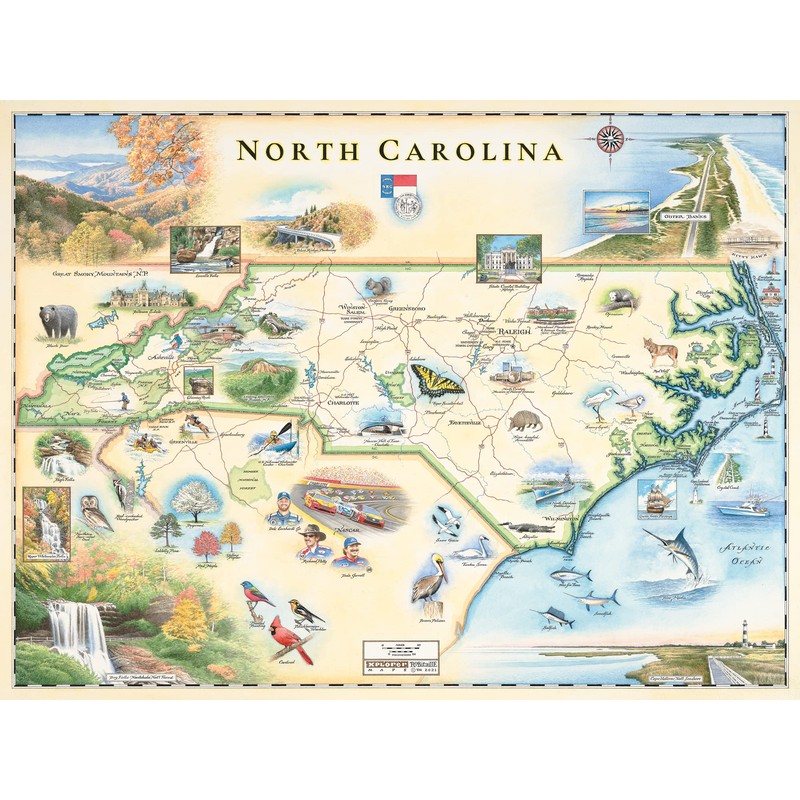 Xplorer Maps North Carolina Hand-Drawn Map – 24x18 Vintage-Style Lithographic Print – Made in USA