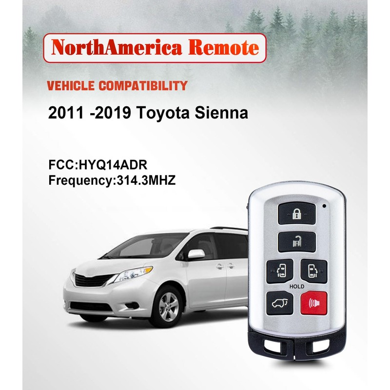 - Please note compatibility: Our replacement key fob is designed to be compatible with 2011 - 2019 Sienna.Please match your FCC ID# HYQ14ADR.